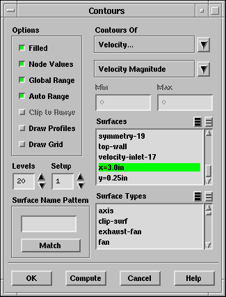 В панели Contours (Распределение) выберите Velocity... (Скорость...) и Velocity Magnitude (Величина скорости) в списках Contours Of (Распределение).